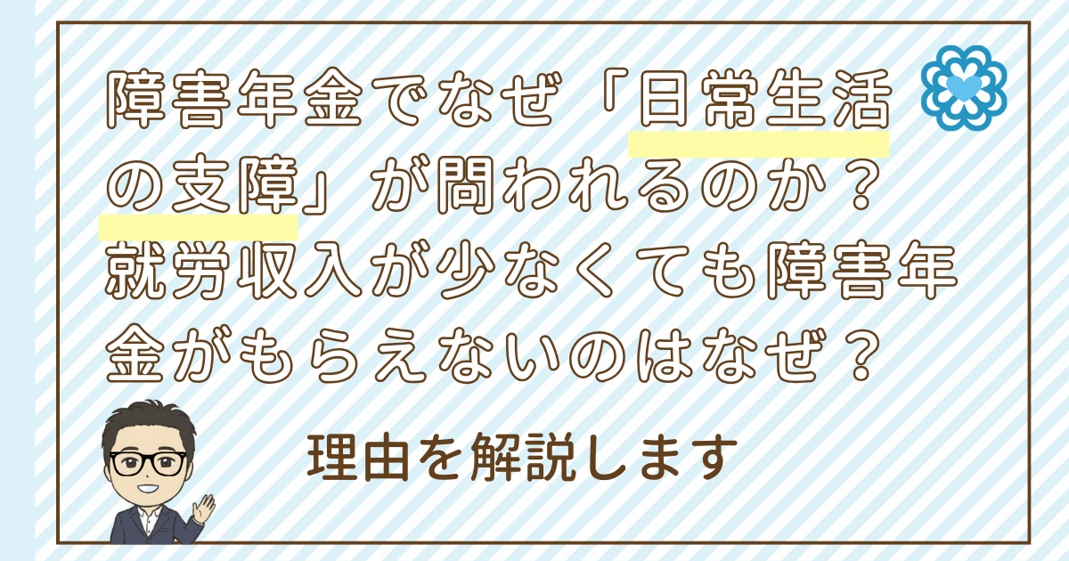 つまり、「日常生活能力≒お金を稼ぐ能力」とみなして、日常生活能力の支障によって、障害等級を決めているというのが実態です。